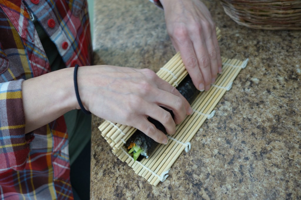 - Use your thumbs underneath the mat and the use your fingers to curve the sheet over the inside of the sushi roll. It doesn’t matter if you don’t get a first really tight roll because when you continue to roll it it will tighten even more.